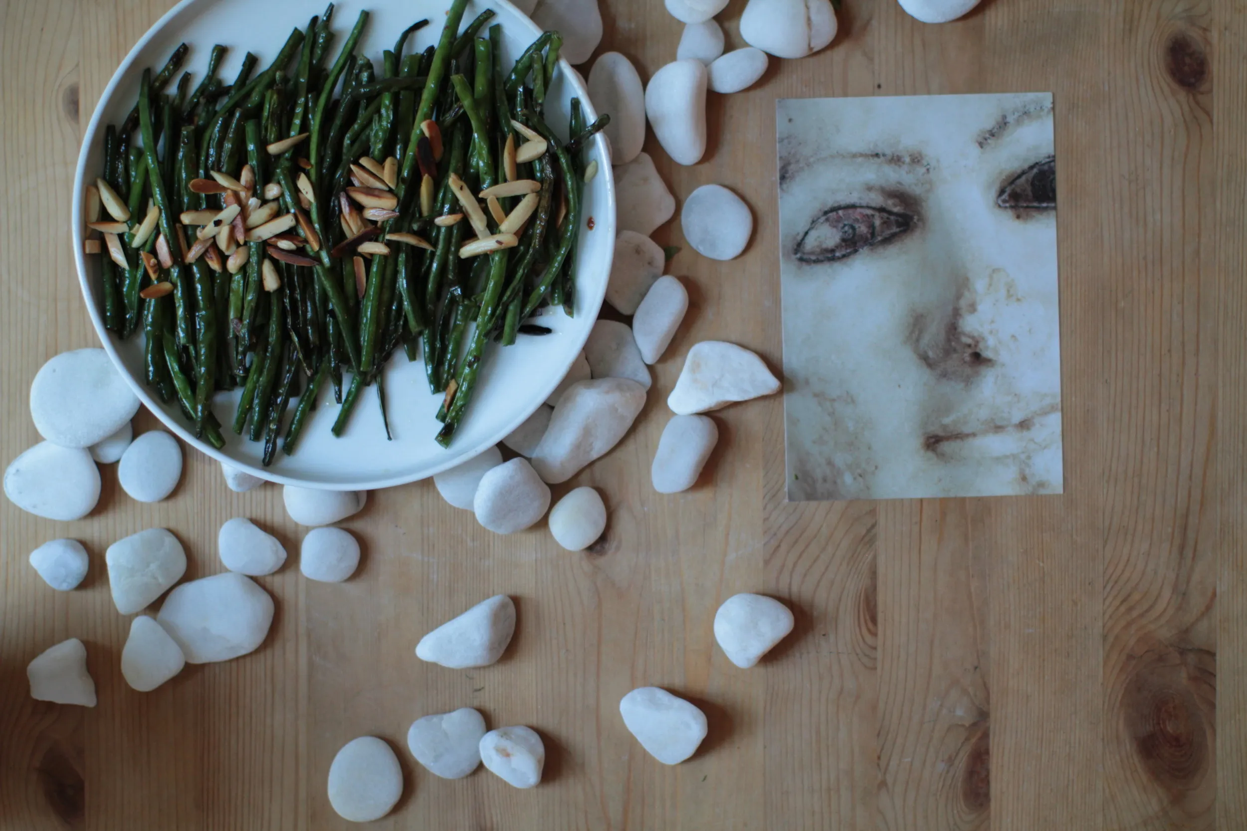 I paired the image of this sculpture with a very simple dish of green beans, a food that reminds me of a landscape of vertical trees one might run through—a wild forestland befitting a goddess who ran with the animals of the woods. I admire their simplicity and how easily they can be turned into a very nourishing food; this is something you could make by a campfire if you wished. Cooked quickly at high heat in a cast-iron skillet these beans produce a crunchy, blistered texture. If you prefer your beans softer, you can boil them for a few minutes first, but be first to dry them before putting them into the hot skillet.