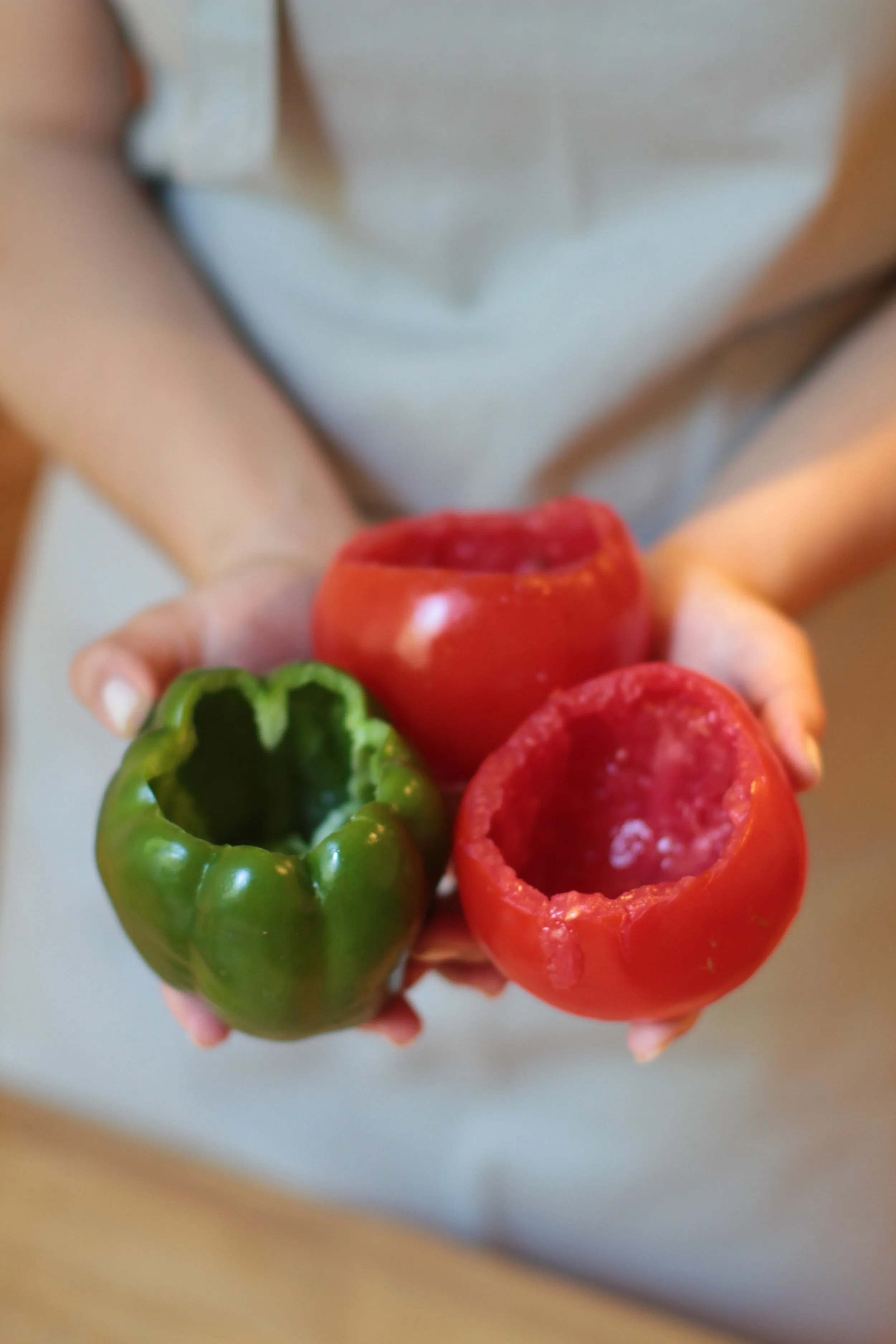 - Use a spoon to scoop the mixture into the tomatoes and peppers.