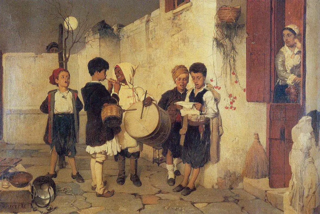 Nikoforos Lytras was a 19th century painter from the island of Tinos, Greece–an island whose rich artistic history has also produced the famous artists Nikoloas Gyzis, painter (1842-1901), and sculptor Yannoulis Chalepas (1851-1938). Lytras studied at the Athens School of Arts, where he painted mostly historical paintings, and after studying in Munich and returning to Greece, evolved into painting daily scenes of life. He spent his life teaching painting at the Athens School of Arts. His Calanda painting above—meaning “carols” in Greek—is a national treasure of Greece, depicting a scene that could have been inspired in any traditional Greek village, but that I like to think was set in Tinos. A women leans upon her doorframe to listen to five children caroling under a full moon, as a sixth watches forlornly from behind a wall.