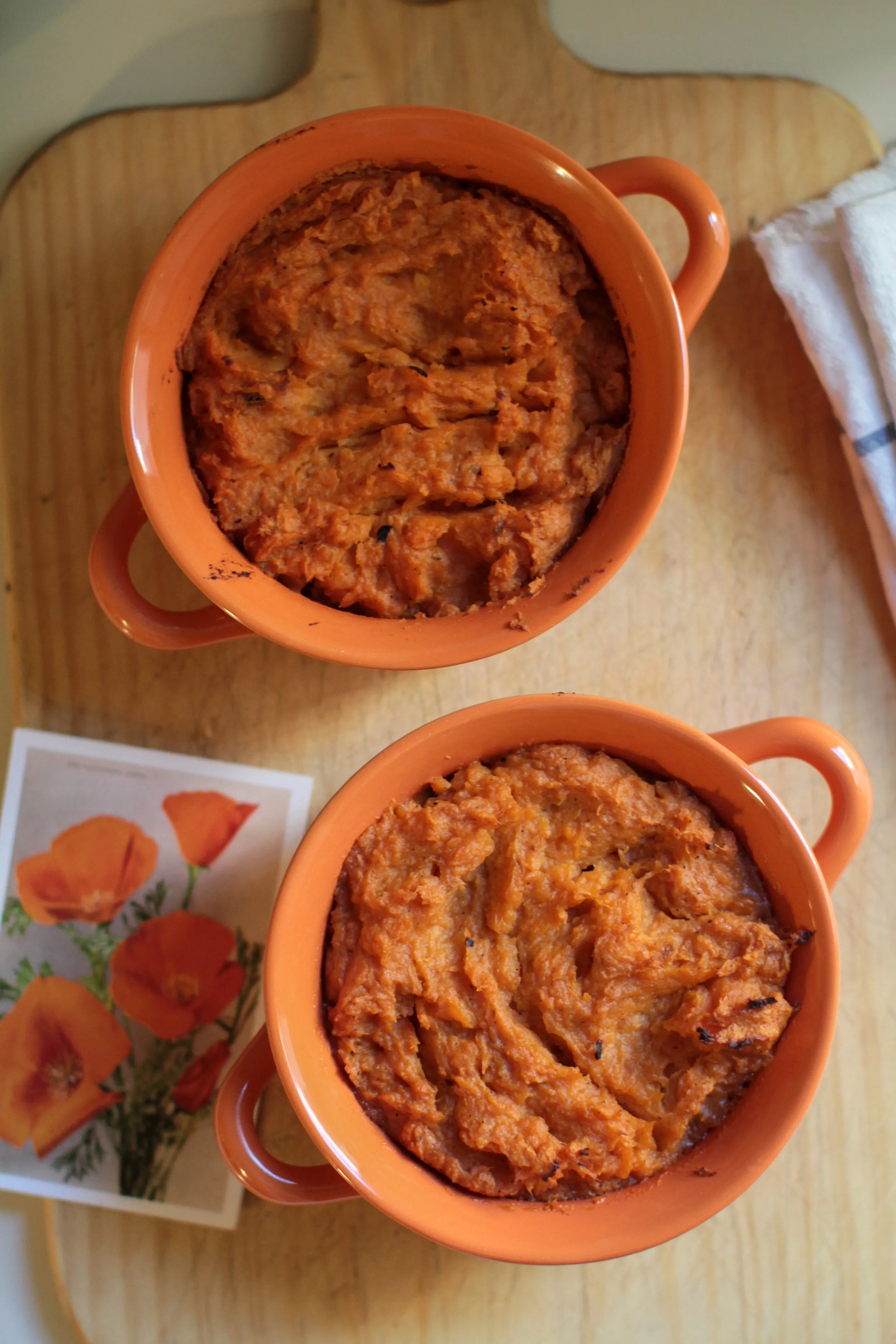 This pairing celebrates a favorite postcard of mine, bought on a trip to Muir Woods with my (now) husband. It is a vintage image of California poppies. The red poppy found in the Greek islands was always my favorite flower for its strong vividness paired with delicacy, and I never knew that an orange variety existed until Joseph introduced me to them in California. Just in time for Thanksgiving, the image pairs beautifully with a classic sweet potato mash. I adapted an Ina Garten recipe given to me by Tom Clarke, a fellow Marshall Scholar who brought this dish to the Marshall Scholar Thanksgiving Dinner celebrated annually by scholars while living in the U.K.. My family’s Thanksgivings tended toward the healthy, and a sugar-enriched dish like this was previously nowhere on my radar. It was a wonderful discovery that I recreate every year: worth the indulgence, enlivened with orange juice, full of flavor, this mash is the perfect creamy, buttery comfort to celebrate gratitude with. Happy Thanksgiving!