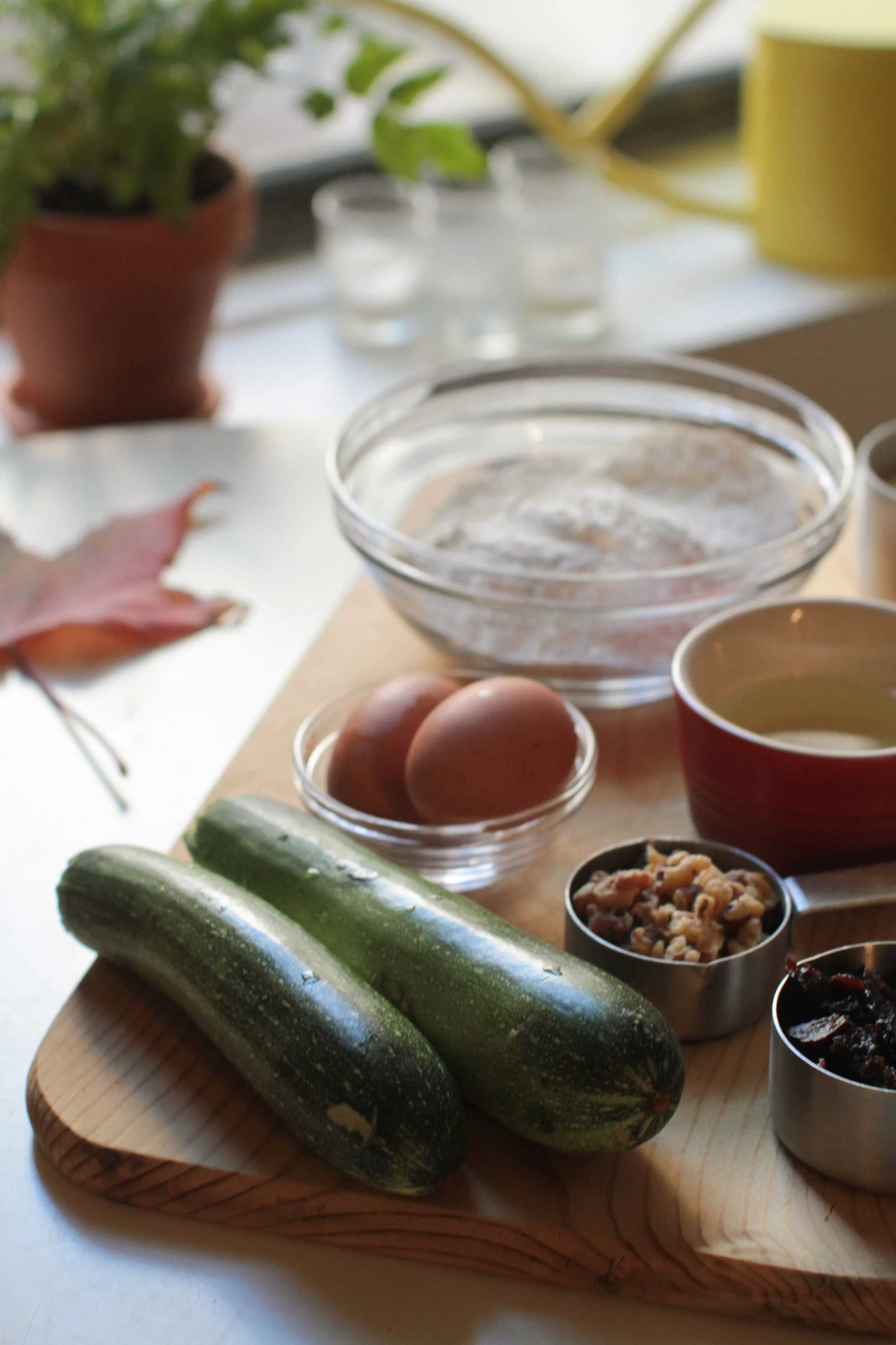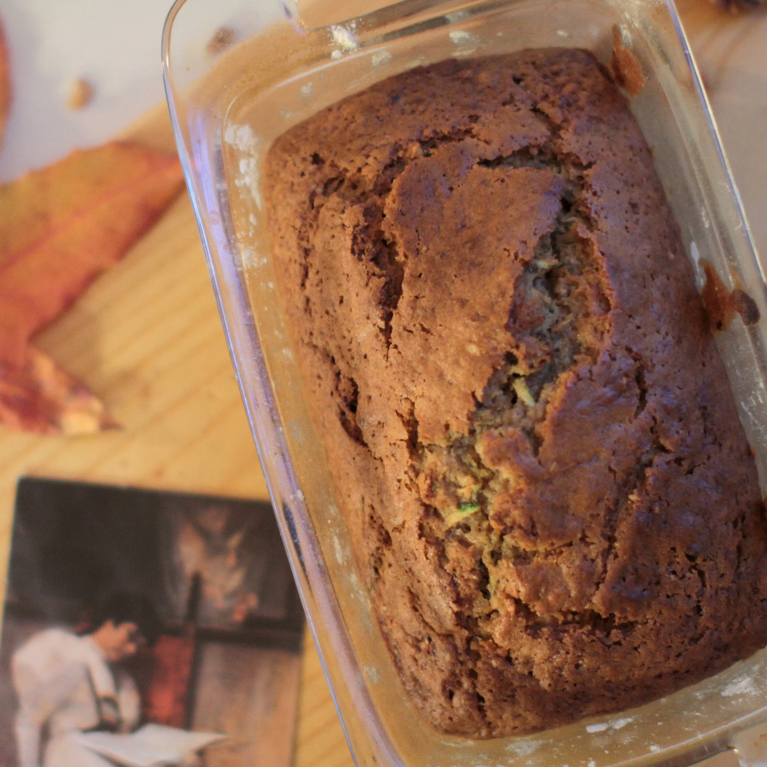 Grease and lightly flour one 8 ½-by 4 ½-inch (21.5-by-11.5-cm) loaf pan. Using the large holes of a box grater-shredder or the large-holed shredder bald of a food processor, shred the zucchini. You should have about 1 cup (5 oz/155g), some more is fine. Set aside.
